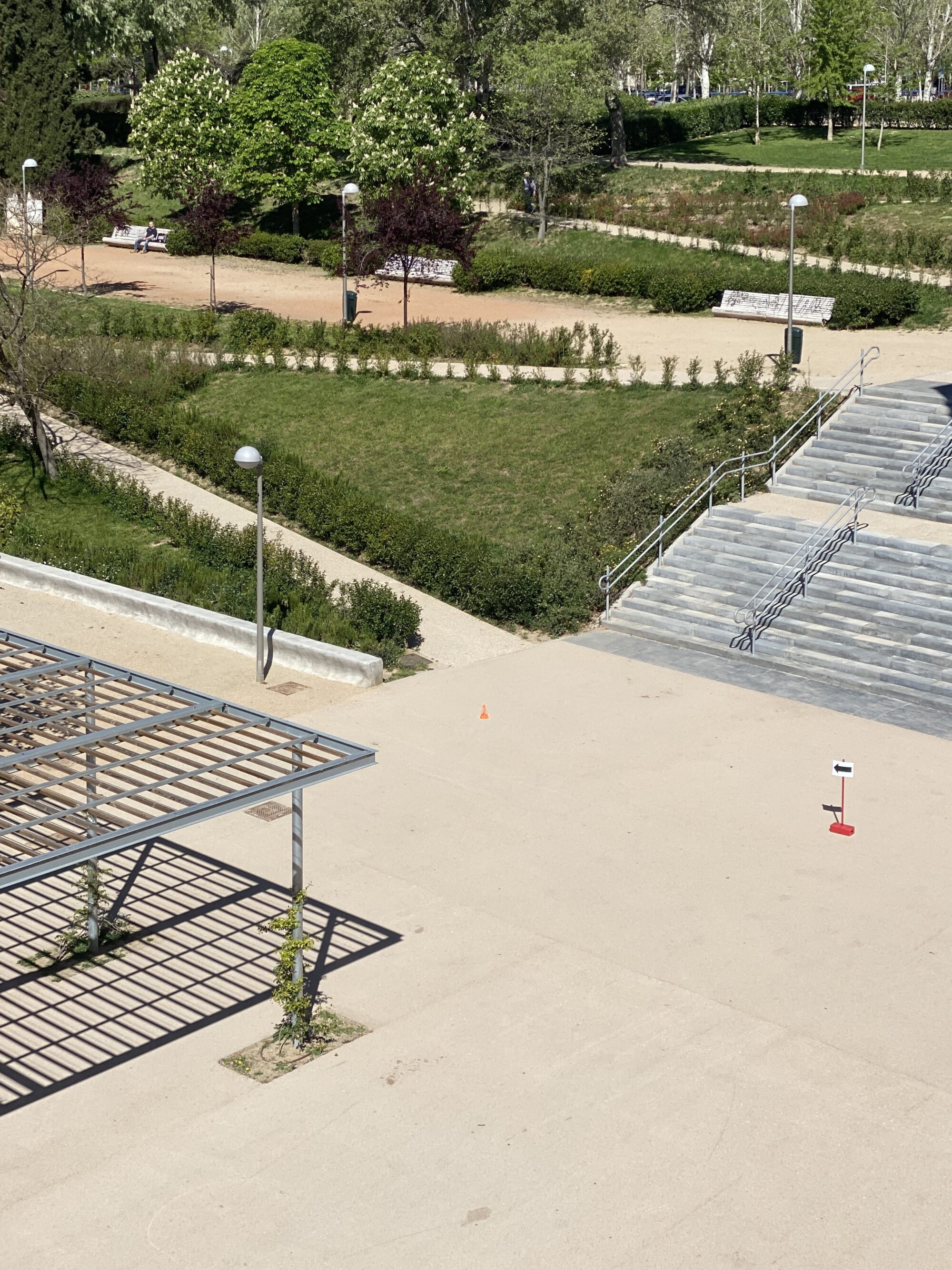 Toda la superficie de actuación se pavimentará con un hormigón poroso, que drena las aguas pluviales alimentando el subsuelo urbano, tan maltratado en nuestras ciudades. Al mismo tiempo al presentar colores claro, el pavimento de hormigón absorbe la luz y almacena menos calor de la radiación solar, reduciendo así el efecto isla de calor. La superficie de hormigón presentará una isla para la ubicación de una zona de juego infantil, que se cubrirá con virutas de madera, como pavimento de protección de caídas. Varios pequeños islotes más, cubiertos con virutas de madera, vendrán plantados con árboles de hoja caduca, que den sombra durante las épocas de calor, y dejen pasar el sol en invierno. El pabellón existente junto al estanque se rehabilitará para albergar un café donde encontrarse en días soleados. Una plataforma de madera se adentrará en el estanque, ofreciendo una panorámica privilegiada donde tomar un café, o simplemente tumbarse al sol. Los caminos sinuosos que bajaban por el bosque de pinos se completarán cerrando con formas orgánicas la superficie de pradera plantada de pinos, extendiendo la masa de pinos y acercándola al nuevo estanque. Bancos curvos multiplicarán las superficies de bancos a la sombra. Los aparatos de gimnasia se trasladarán junto a esto bancos curvos, desde donde padres y abuelos podrán observar cómo juegan sus pequeños. Nuevas rampas darán acceso a personas con movilidad reducida desde el paseo de la Vaguada, completando los accesos al futuro teatro remodelado, y desde la avenida Monforte de Lemos, abriéndose al barrio del Pilar y facilitando el acceso desde el centro comercial.